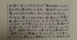 手の先まで常に痺れがあり、肩の痛みは激痛で夜も眠れない日々でしたが、マッサージが終わった時、痺れをほぼ感じなくなっていました。