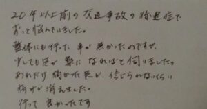 20年以上前の交通事故の影響でずっと悩んでいました。整体にも行ったことがなかったのですが、少しでも足が楽になればと伺いました。