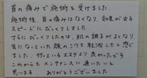 前回は首の筋が痛く、肩のこりもあり、カミさんの勧めもあり、施術を受けたところ、すぐに痛みはなくなり、こりも楽になりました。